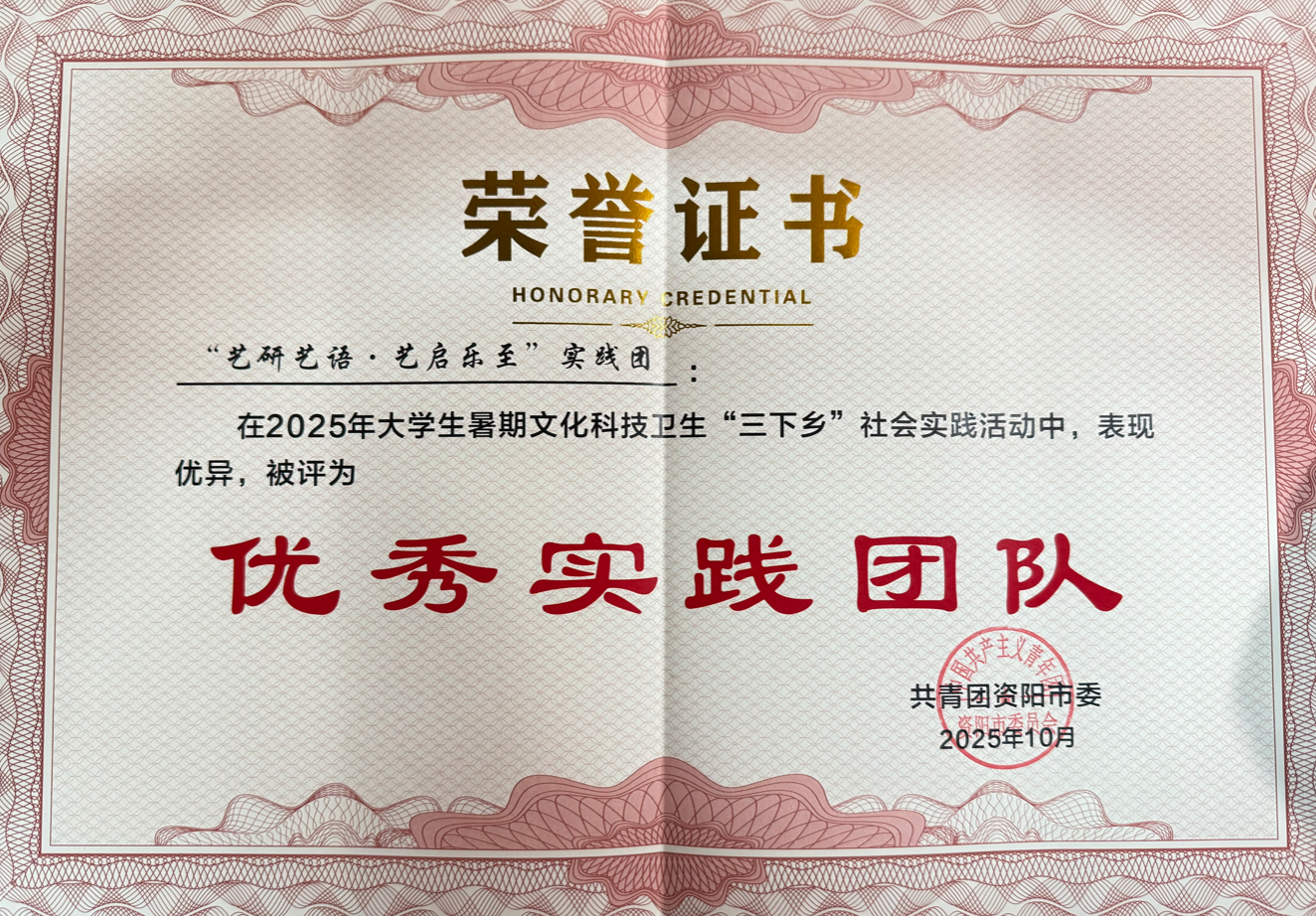 近日,共青团资阳市委印发《关于表扬 2025 年大学生 “逐梦扬帆计划”“三下乡” 社会实践活动先进典型的通知》,我院 “艺研艺语・艺启乐至” 暑期社会实践团队凭借扎实的实践成效与突出的服务成果,成功入选 “2025 年资阳市大学生暑期文化科技卫生‘三下乡’社会实践活动优秀实践团队”,同时该团队还获评四川农业大学暑期社会实践 “专项卓越团队”,成为校地协同助力乡村振兴的青年典范。