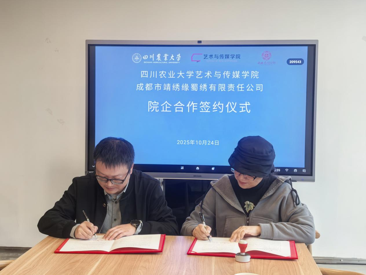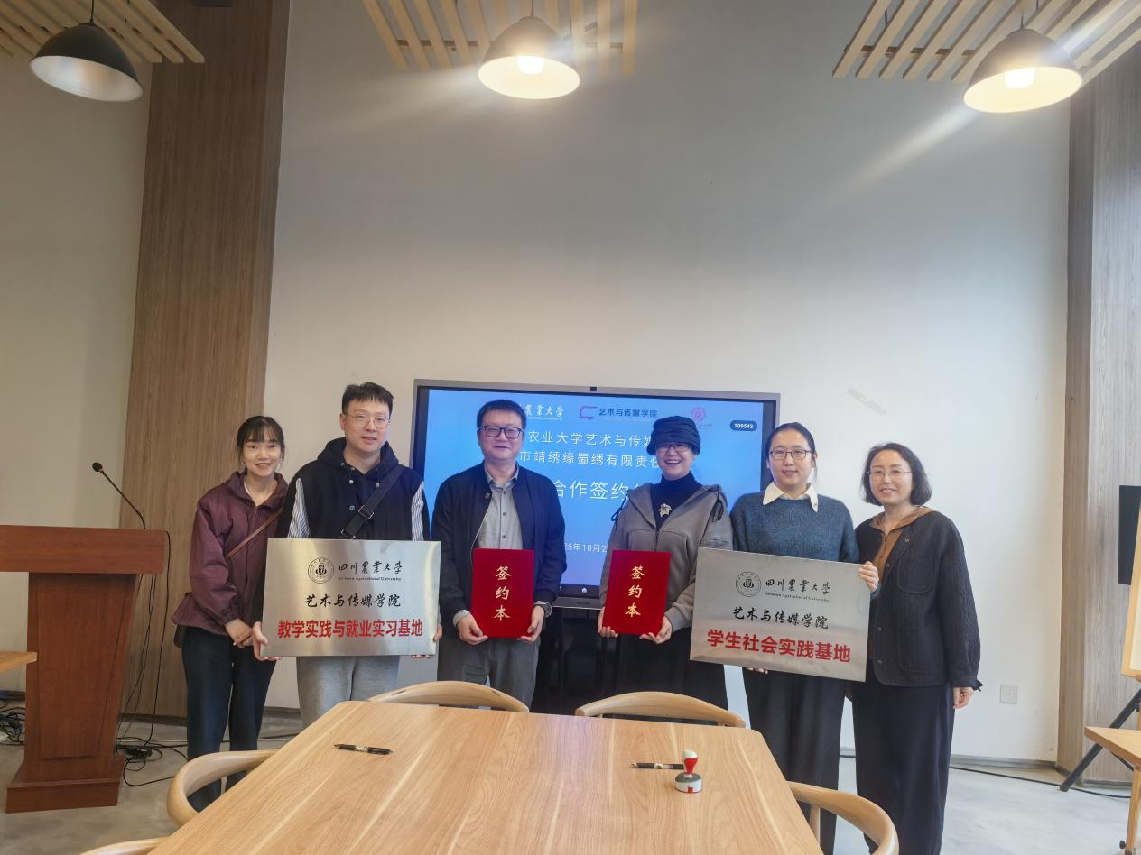 为进一步推动非物质文化遗产的传承与创新,深化产教融合,探索院企合作新模式,10月24日,四川农业大学艺术与传媒学院与成都市靖绣缘蜀绣有限责任公司举行院企合作签约暨授牌仪式,艺传学院党委书记朱雨欣,学院党委办公室副主任刘雨逍、视觉传达设计系骨干教师宋畅与靖绣缘蜀绣有限责任公司相关人员出席了本次签约仪式。
