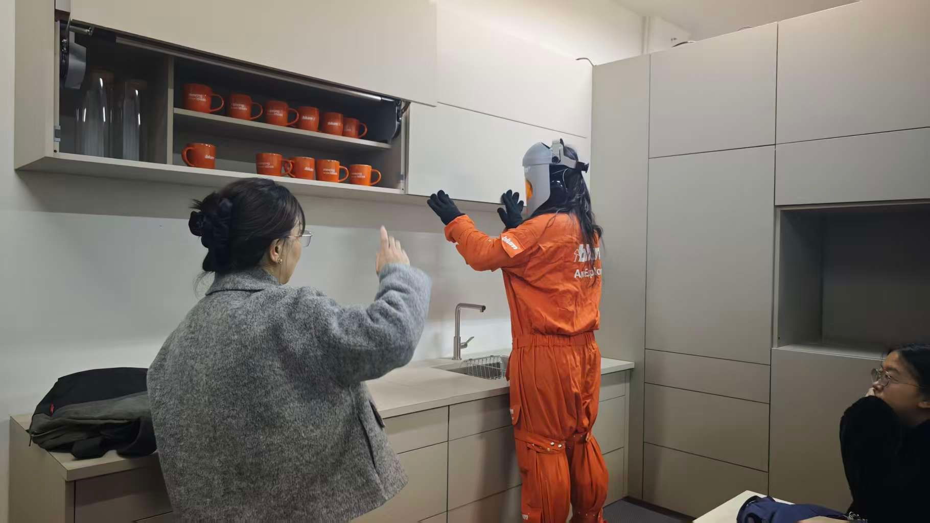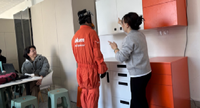 为了更直观理解适老化设计需求,课程组老师组织学生穿戴老年行动模拟体验装置,模拟老年人在视力下降、关节僵硬、行动受限等情境下的真实使用状态。学生需在模拟环境中体验开门、取物、弯腰、举手等动作,切身感受高位柜、深柜、传统开门结构等在老年使用中的潜在障碍。通过这种体验式教学,学生进一步认识到上翻门系统、阻尼技术、轻触开合等五金创新对弱势群体的友好价值,真正做到从“看见问题”到“理解问题”,再到“设计解决方案”。