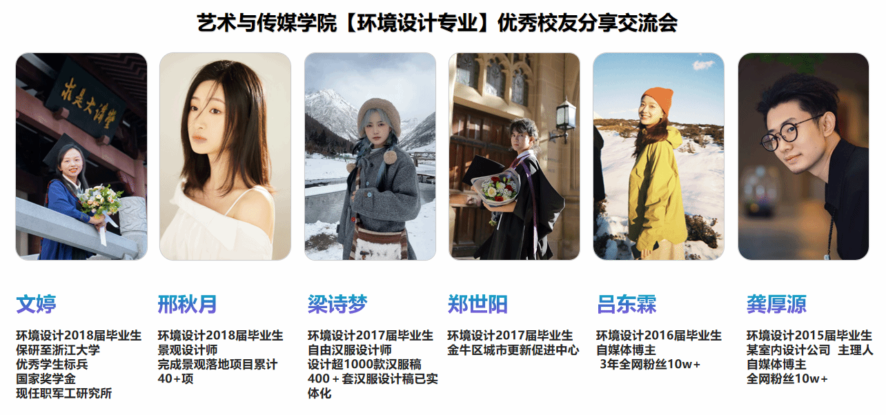 这些多元而鲜活的职业轨迹,向新生生动诠释了环境设计专业的广阔延展性与跨界潜力,也共同传递出一个重要信息:多折腾、多尝试,敢于走出舒适区;不断提升思维能力、表达能力与自信心,是迈向卓越职业发展的共同底色。