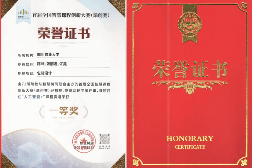 近日,首届“智慧树杯”全国智慧课程创新大赛评选结果正式揭晓,四川农业大学艺术与传媒学院陈坤、张丽君、江霞教师团队,携国家级一流本科课程《包装设计》的课程创新项目,在“人工智能+”课程赛道中,经初赛、复赛两轮严格的专家评审,最终脱颖而出斩获一等奖。