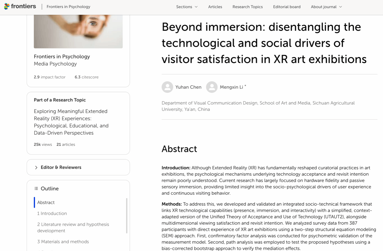 近日,我院传来喜讯:视觉传达设计专业2023级本科生陈禹含以第一作者在国际期刊 Frontiers in Psychology(JCR一区SSCI)发表学术论文《Beyond immersion: disentangling the technological and social drivers of visitor satisfaction in XR art exhibitions》(超越沉浸感:解构XR艺术展览中观众满意度的技术与社会驱动因素),论文由李梦馨博士担任通讯作者。这一成果标志着我院本科生在高水平学术研究领域实现新的突破。