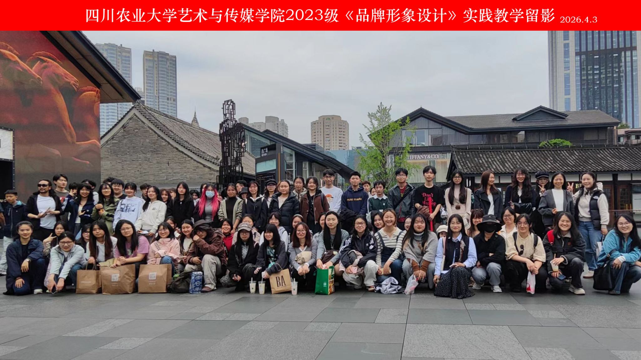 2026年4月3日,四川农业大学艺术与传媒学院2023级视觉传达设计专业148名师生,在课程组教师江霞和李梦馨的带领下,赴成都IFS、远洋太古里开展《品牌形象设计》课程实践教学活动。