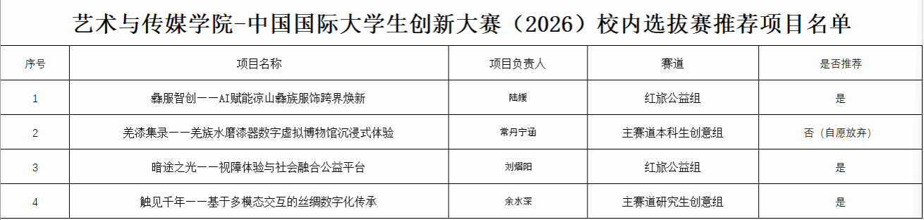 艺术与传媒学院-中国国际大学生创新大赛(2026)校内选拔赛推荐项目认定结果公示