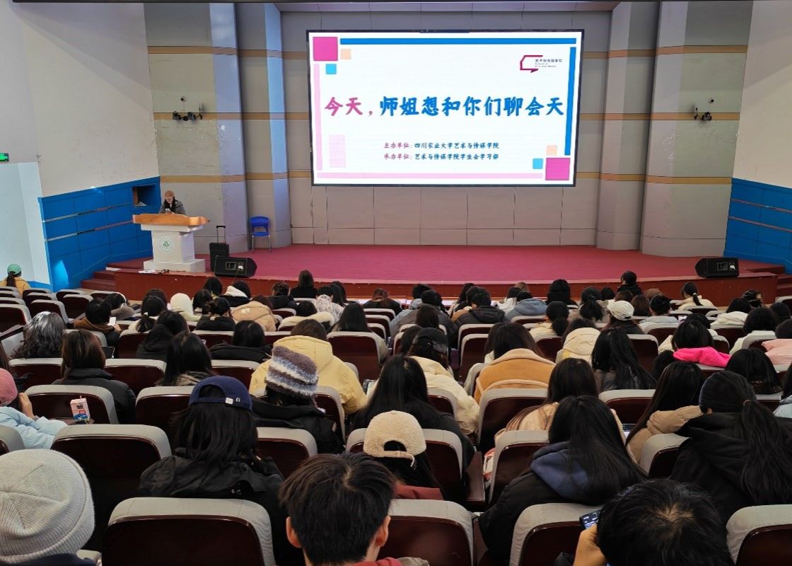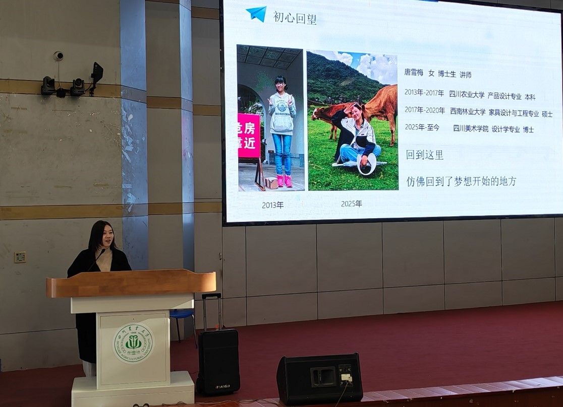 讲座以“今天,师姐想和你聊会天”为题,成功搭建校友与在校学生的沟通桥梁,通过前辈的亲身经历破除信息壁垒,帮助同学们规避成长误区、明晰发展方向。唐博士以时间为轴,回溯了自己从川农产品设计本科出发,到西南林业大学攻读硕士,再到四川美术学院深造博士的十二年成长历程。她分享了大一投身社团、组织公益活动的热忱,大二深耕专业、加入工作室的积累,大三创办 “魔术手工作室”、投身创业竞赛的拼搏,以及大四幡然醒悟专注考研的坚守,鲜活的经历让现场学子产生强烈共鸣。